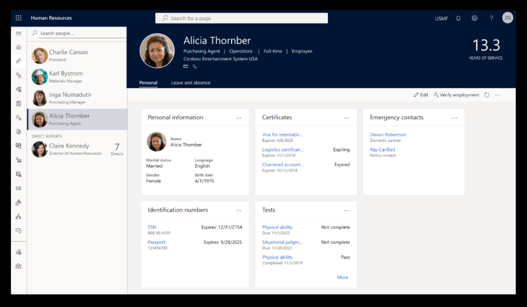 Dynamics 365 Human Resource provides robust reporting and analytics features. It offers pre-built reports and dashboards to monitor key HR metrics, track workforce trends, and make data-driven decisions. The platform also allows customization of reports and visualizations based on specific business needs.